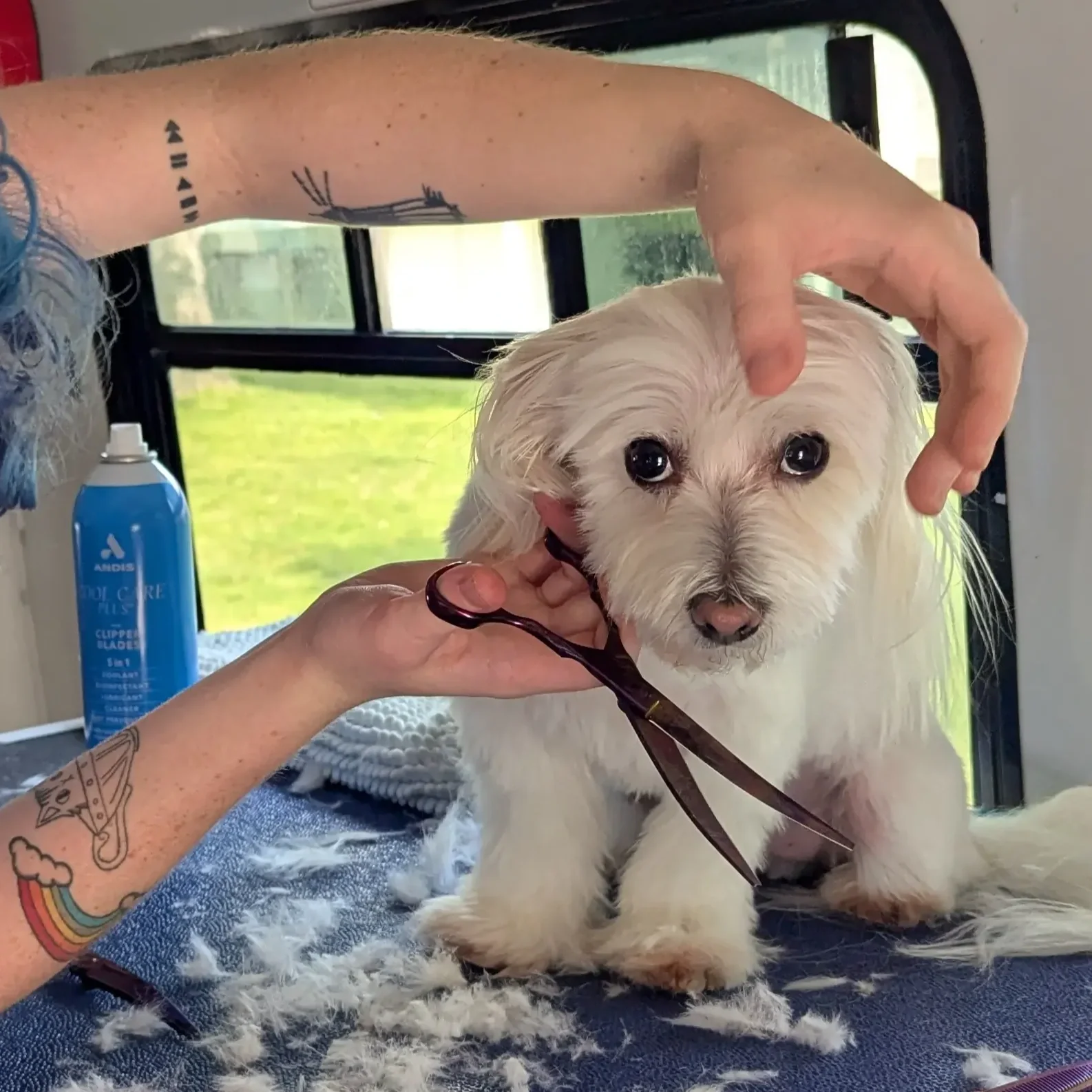 We are equipped with a variety of clipper blades and professional shears that will make your pets haircut experience quick, clean, and painless. Whether its a sanitary trim, a quick clean up, or a full shave, we can make it happen on the Fluff Bus!
