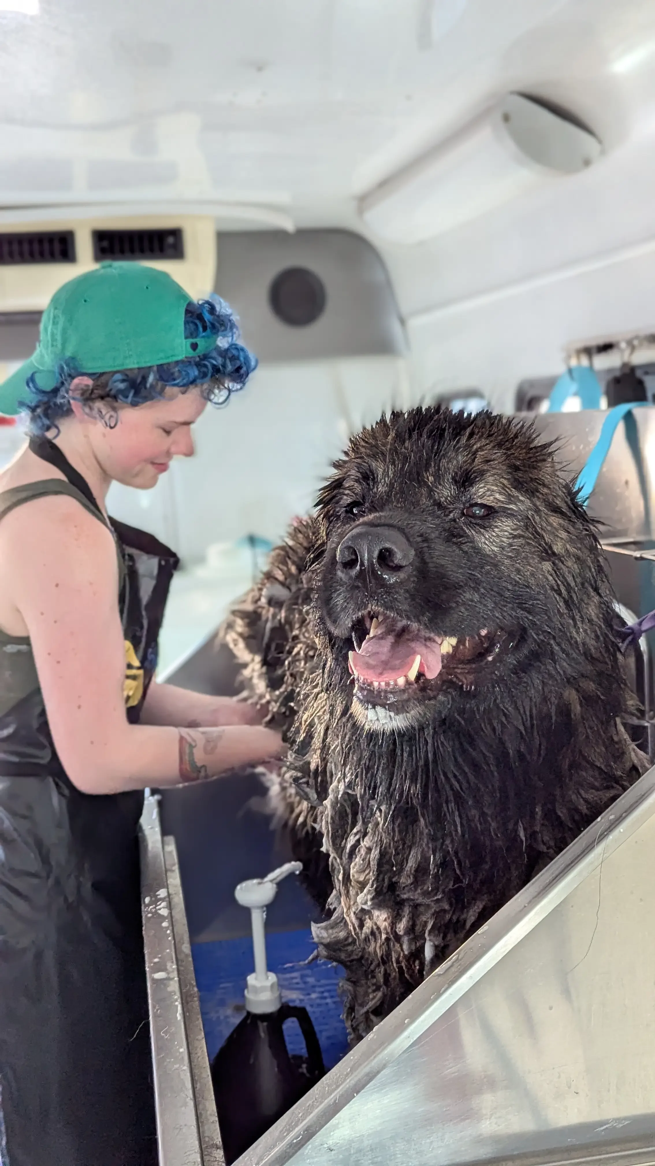 We have no size limits on the Fluff Bus! Our large capacity tub features a ramp which bridges to our adjustable grooming table.